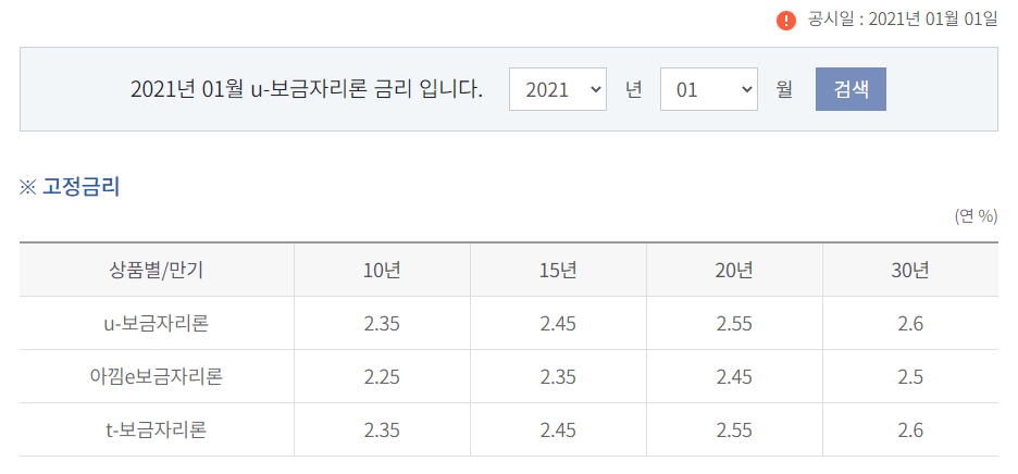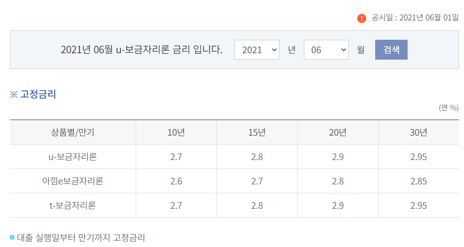 이게 포인트다. 그럼 금리가 중요하다. 금리는 어떻게 될까? 현재 공시일 2021년 6월1일 기준으로 금리를 살펴보도록 한다. 고정금리u-보금자리론은 10년 2.7%, 15년 2.8%, 20년 2.9%, 30년 2.95%다. 아낌e보금자리론은 10년 2.6%, 15년 2.7%, 20년 2.8% 30년 2.85%다. t-보금자리론은 u보금자리론과 동일하다.