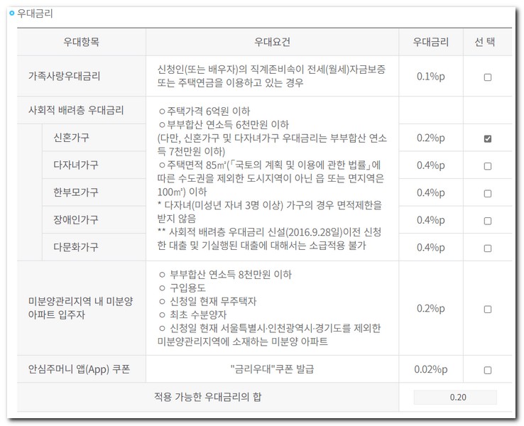높아진 금리만큼 우대금리가 굉장히 중요하다. 우대금리는 가족사랑우대금리, 사회적 배려층 우대금리, 신혼가구, 다자녀가구, 한부모가구, 장애인가구, 다문화가구, 미분양관리지역 내 미분양 아파트 입주자, 안심주머니 앱(App) 쿠폰 이 존재한다.