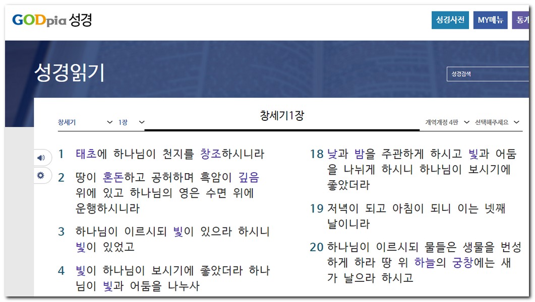갓피아(GODpia)성경읽기 사이트다. 성경읽기를 바로 할 수 있거나 성경필사, 성경통독도 함께 할 수 있다. 필요한 성경 내용이나 장, 절을 쉽게 검색할 수 있으며 개정판 부터 시작해서 구약, 신약을 나눠서 검색도 가능하다.