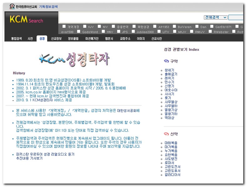 오래전에 만들어진 인터넷 성경사이트이며 KCM성경타자에서는 성경책에 있는 내용을 손쉽게 검색해서 인터넷으로 바로 읽어볼 수 있도록 만들어진 사이트다.