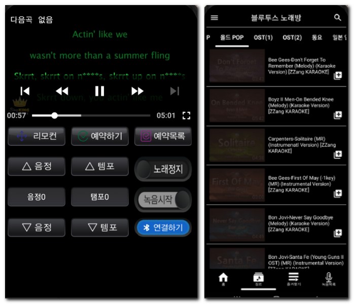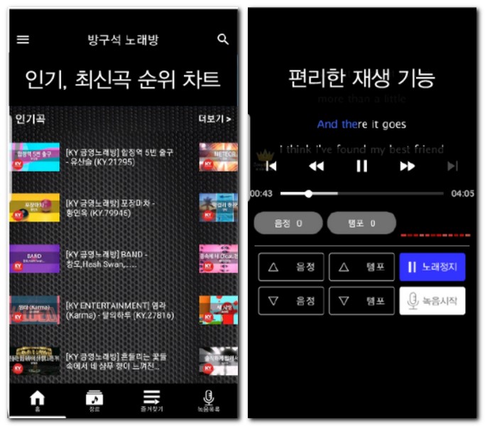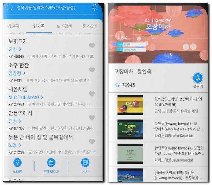 무엇보다 단순하게 노래방 기능뿐만 아니라 뮤직비디오도 함께 감상할 수 있어 마치 노래방에 온것처럼 착각이 들 정도다.