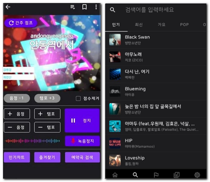 코인 동전 노래방 기능을 핸드폰 앱에 그대로 담아놨다. 무료로 MR이 흘러나오는 노래를 부를 수 있고 녹음까지 한 번에 가능하다. 스마트폰으로 노래반주를 들으면서 노래방 분위기를 즐길 수 있는 앱이다.