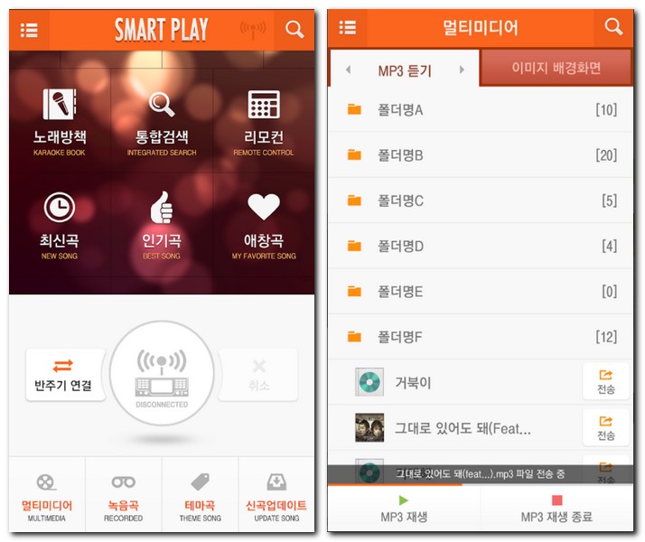 여러가지 기능들이 존재하는데, 노래방책, 통합검색, 음성검색, 노래방리모컨, 최신곡, 인기곡, 애창곡, 스마트폰에 저장된 MP3듣기, 녹음곡 저장, 테마곡 등의 기능이 있다.