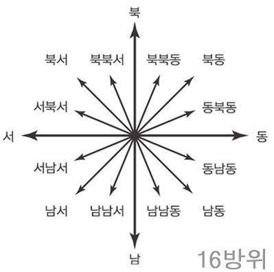 북서 North-West 남동 South-East 북동 North-East 남서 South-West16방위