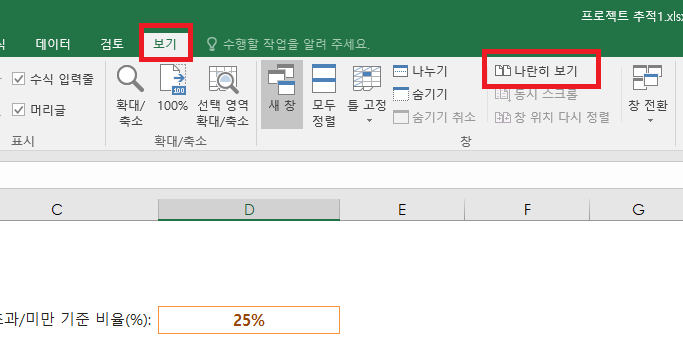 상단 메뉴에 보기 버튼을 클릭 -> 나란히 보기 클릭.