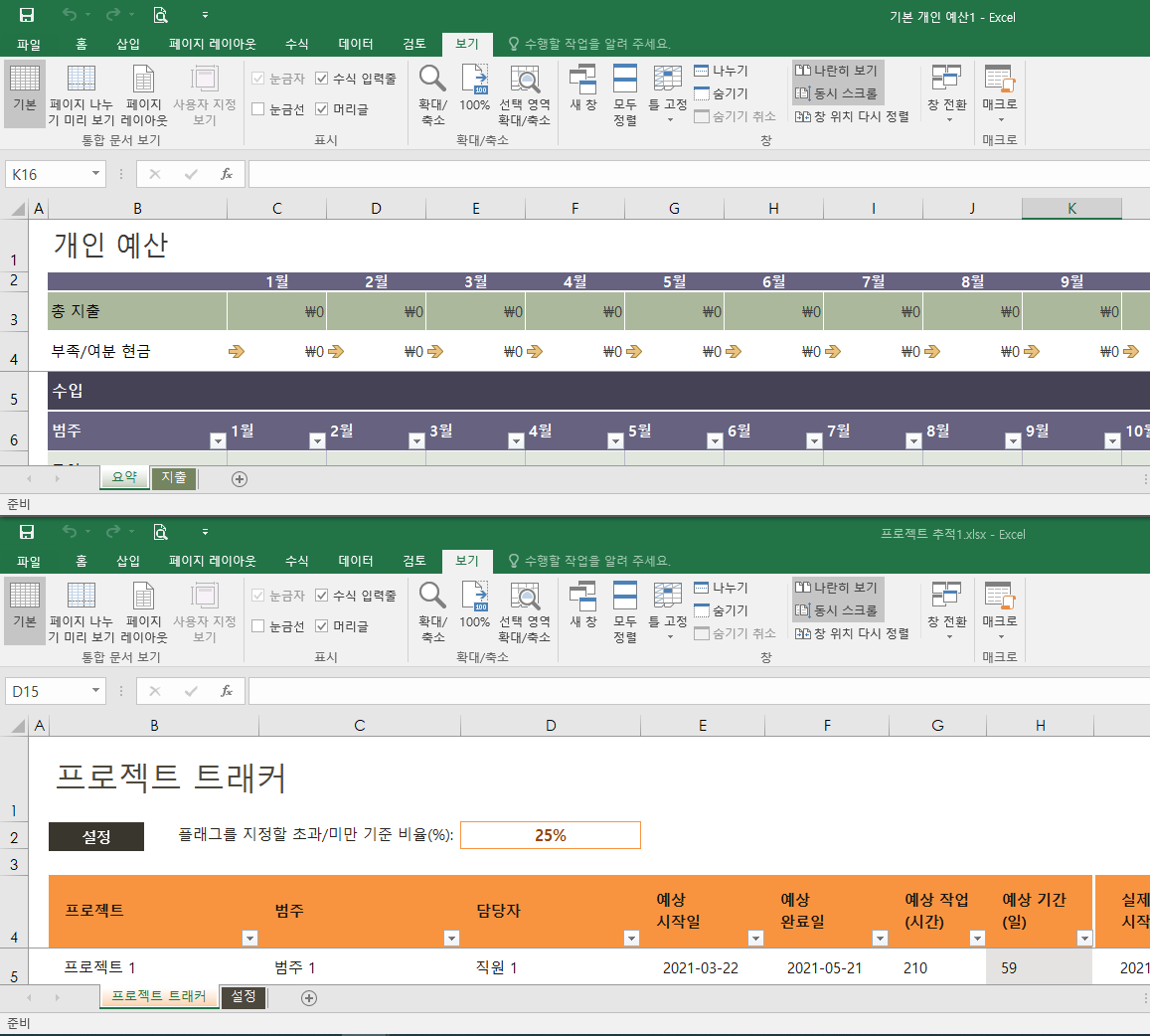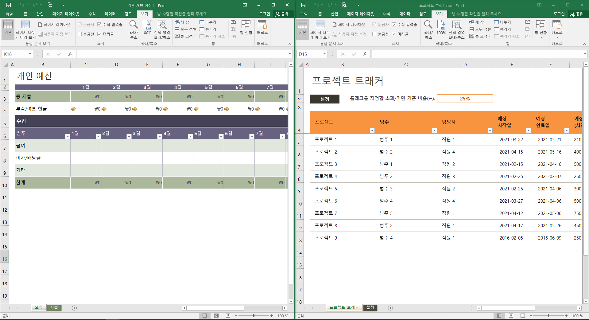 엑셀2016을 실행한 모습이다. 우선 엑셀 파일 2개를 각각 실행시킨다. 더블 클릭해서 실행해도 되고, 파일 불러오기를 통해서 2개를 동시에 실행시켜도 상관없다.