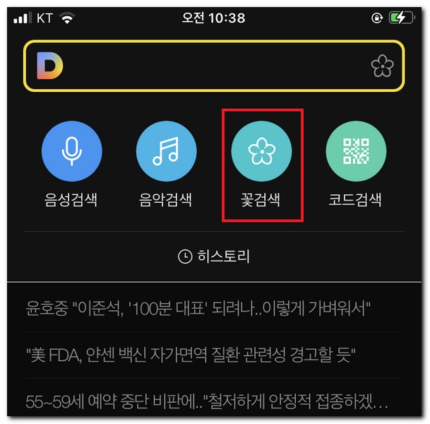 음성검색, 음악검색, 꽃검색, 코드검색 총 4가지 모양의 아이콘이 나타나게 되는데, 꽃검색 아이콘을 터치한다.