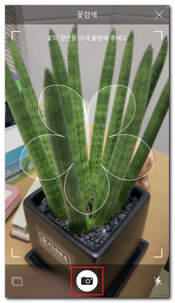 검색하고 싶은 꽃이나 식물, 나무 등에 핸드폰 카메라를 이용해서 촬영 버튼을 터치한다.