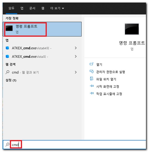 cmd 명령어를 사용해서 디스크 상태점검이 가능하다. 윈도우 시작버튼 -> cmd 명령어를 입력하게 되면 명령프롬프트 앱이 보인다. 클릭한다.