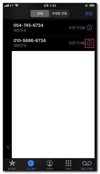 아이폰 최근통화기록 또는 전화 앱을 실행한다. 차단하고 싶은 전화번호가 보이면 ! 표시를 터치한다.(주의! 전화번호를 터치하면 바로 전화연결된다.)