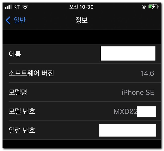 그럼 현재 아이폰 이름과 소프트웨어 버전, 모델명, 모델번호, 일련번호까지 자세히 확인할 수 있다. 모델명은 iPhone SE라고 적혀 있는데 현재 필자가 사용하는 아이폰se는 2020년도에 출시된 아이폰se2 버전이다.