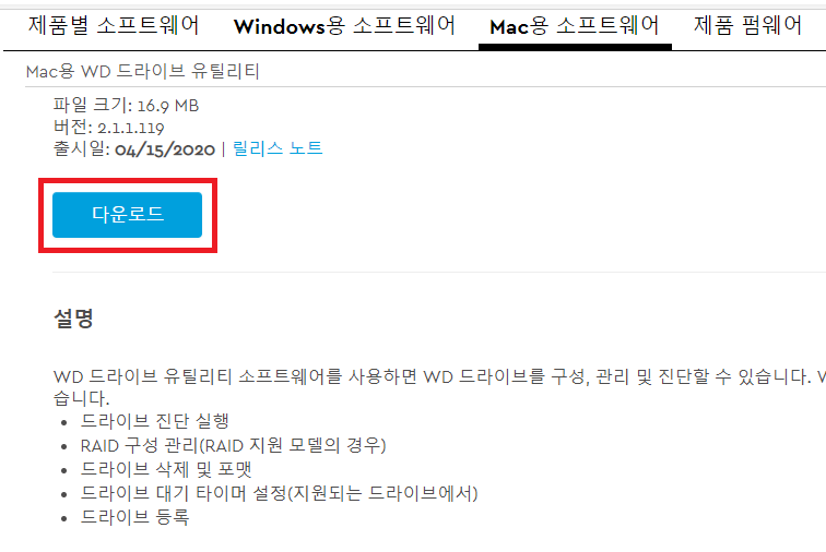 Mac OS 운영체제에서 WD My Passport 드라이버를 설치하고 싶다면 링크 연결된 페이지에서 조금 더 아래쪽으로 스크롤을 내려보도록 한다.