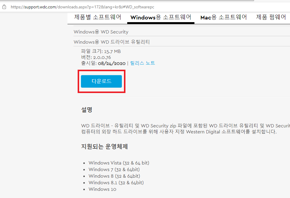 윈도우버전용 WD My Passport 드라이버는 링크 연결된 페이지로 이동하면 된다. 처음 이동했을때 Windows용 WD Security가 보이는데 이 드라이브를 다운받으면 안된다.