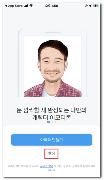 앱을 실행하면 아바타 만들기를 선택하지 말고, 후에를 선택한다. 번역이 잘못되어 있어서 후에로 표시되는데 무시한다.