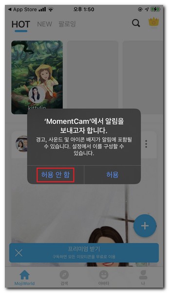 모멘트캠 알림설정에 대해서 물어보는데 허용 안함을 선택한다.