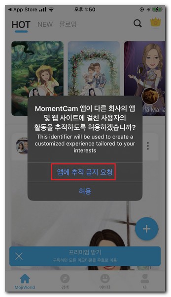 모멘트캠이 다른 회사의 앱 및 웹 사이트에 걸친 사용자의 활동을 추적하도록 허용하겠냐고 물어보는데 앱에 추적 금지 요청을 선택한다.