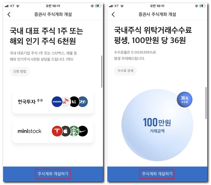 필자는 주식 1개를 공짜로 주고, 100만원당 수수료가 36원이라는 수수료 혜택 덕분에 한국투자증권에 가입하게 되었다. 주식계좌 개설하기 메뉴를 터치하면 계속 진행할 수 있게 된다.