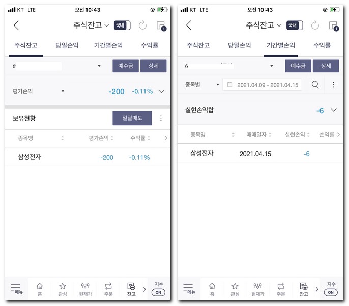 주식을 구입하자마자 바로 평가손익에서 손실이 발생하였다. 처음 주식을 하게 되면 이와 같은 현상을 자주경험하기 때문에 너무 걱정하지 않아도 된다. 주린이라면 단타보다는 장투를 하는것이 좋다.