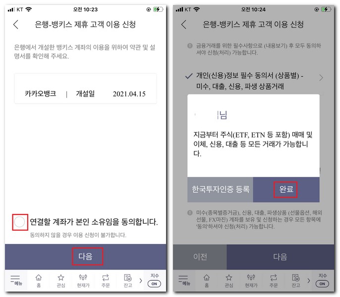카카오뱅크와 계좌연결을 진행해줘야 된다. 최종적으로 주식계좌를 등록한 상태라면 지금부터 주식을 사고 팔고를 진행할 수 있게 된다.