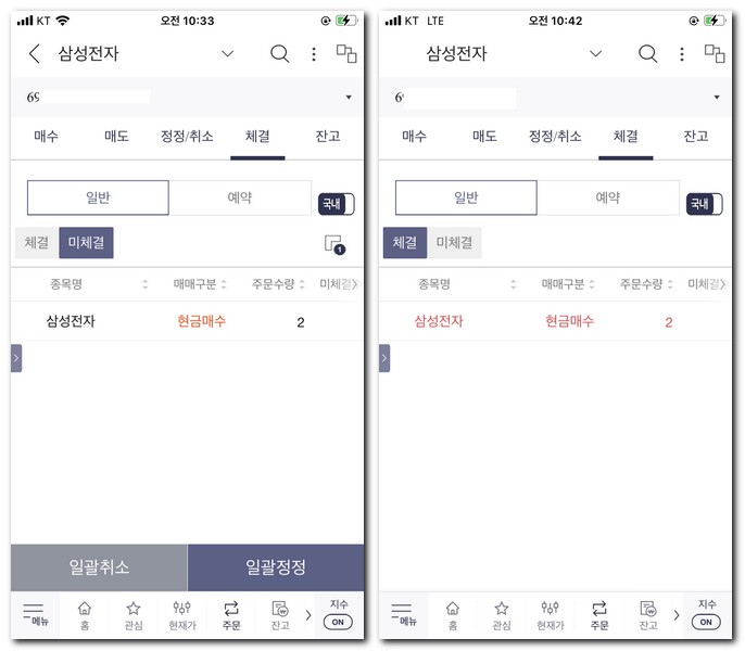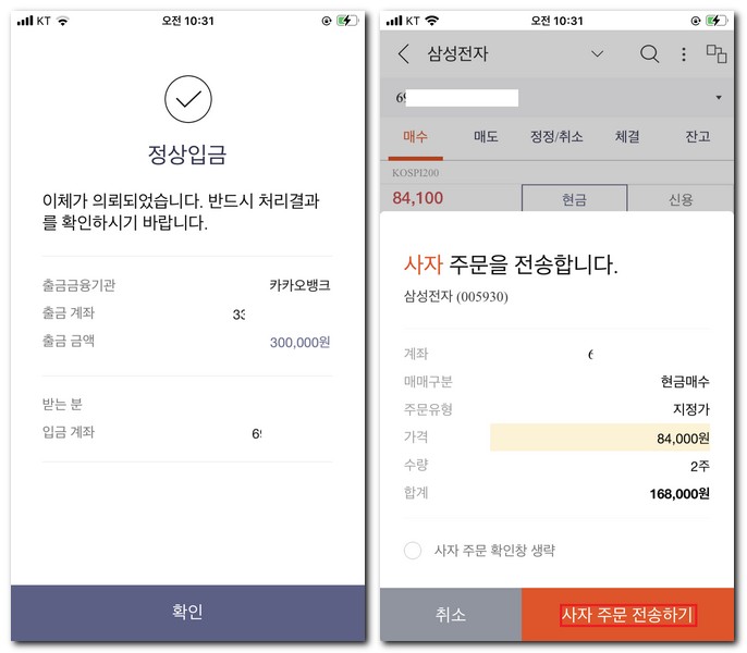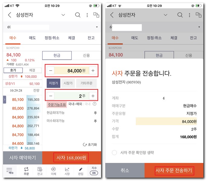 삼성전자 주식을 살려고하는데, 얼마를 살 것인지 선택하고 사자 주문 전송하기 버튼을 터치하도록 하자.