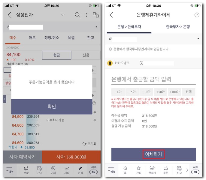 주문가능금액 초과했습니다. 라는 메시지와 함께 거래가 안된다. 그 이유는 현재 주식계좌에 돈이 하나도 없어서 거래가 안되는것이다. 카카오뱅크 계좌와 주식계좌와 연결된 상태라면 계좌이체를 통해서 간편하게 돈을 송금해서 받을 수 있게 된다.