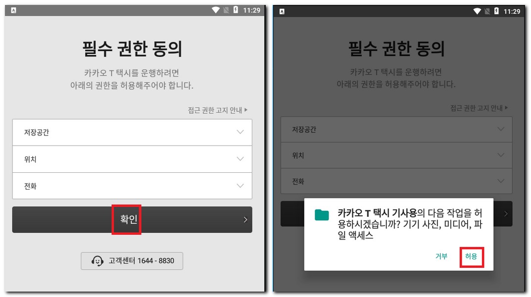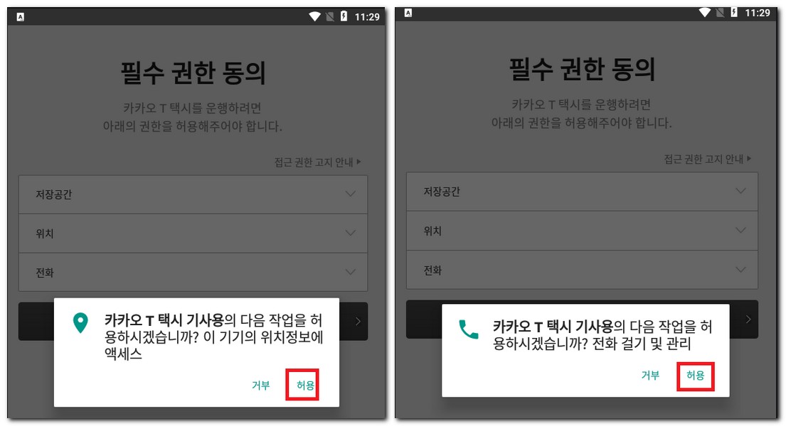 카카오T택시 기사용의 경우 휴대폰 기기의 사진이나 미디어 파일 액세스 권한도 모두 허용해줘야된다. 접근 가능해야 앱을 정상적으로 이용할 수 있다.