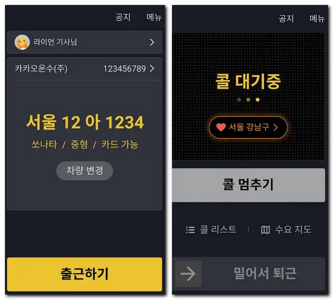 앱을 실행하게 되면 첫 화면에서 콜 대기중과 현재 본인의 차량번호 등을 확인할 수 있다. 출근하기 버튼을 터치하게 되면 콜을 받을 수 있게 된다.