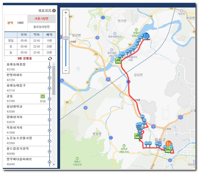 필자가 광역 1002번을 검색해봤더니 지도에서 노선별 정류장 위치가 상세하게 나타난다. 대전 시내버스 노선검색이 이렇게 간편하고 편리하게 할 수 있다는것을 확인할 수 있었다.