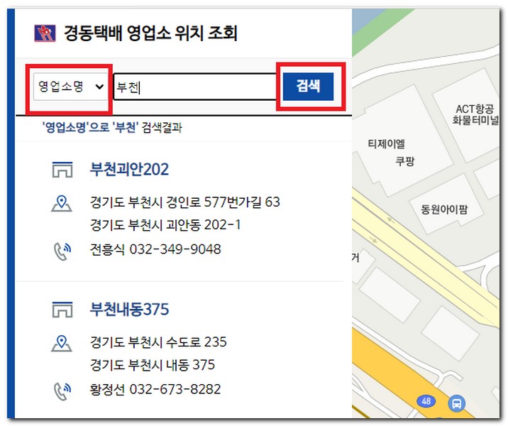 경동택배 영업소 위치 조회가 가능한 페이지로 이동하게 된다.