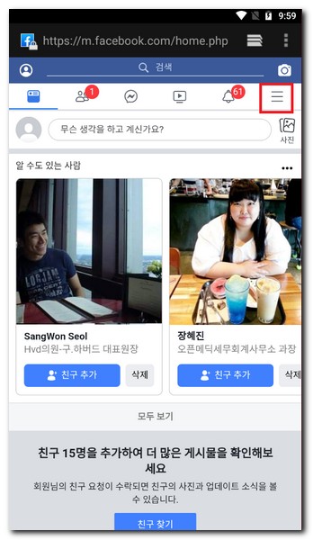 페이스북 로그인을 한다. 우측 상단 메뉴를 터치
