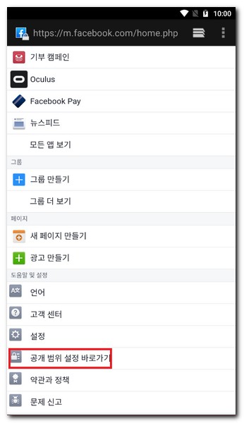 도움말 및 설정 -> 공개 범위 설정 바로가기 터치