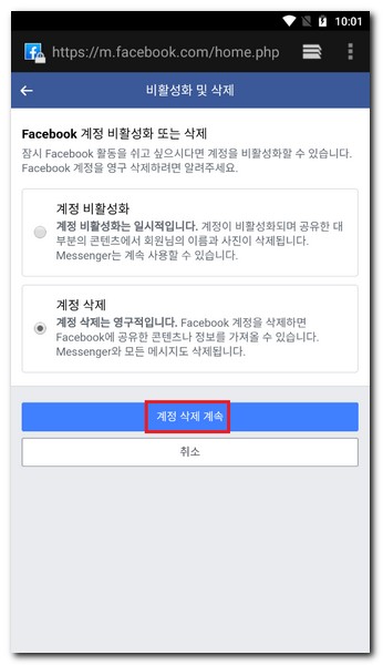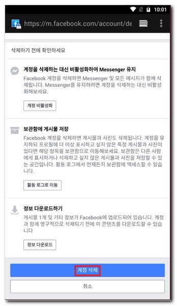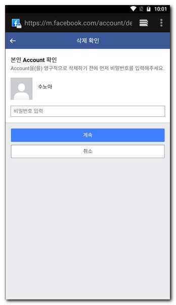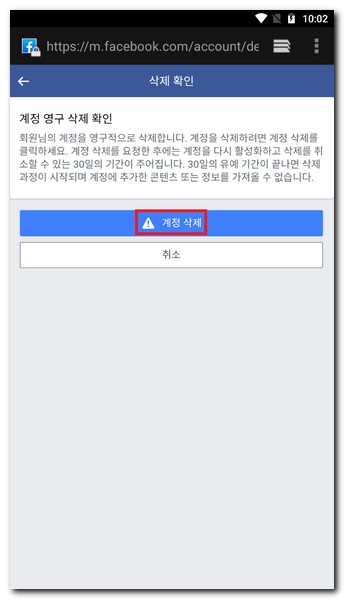 최종적으로 모바일 핸드폰으로 페이스북 계정 삭제 메뉴를 통해 페이스북 탈퇴를 진행하였다. 데스크톱 PC, 태블릿PC에서도 동일한 방법으로 페이스북 탈퇴가 가능하다.