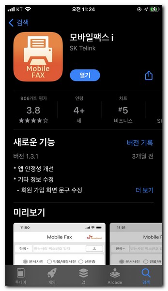 아이폰 모바일 팩스 어플인 모바일패스 i를 앱스토어에서 검색해서 다운로드 받는다.