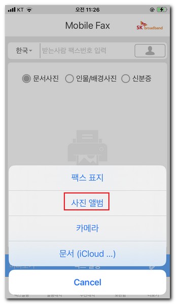 팩스 표지, 사진 앨범, 카메라, 문서(iCloud) 중에 한가지를 선택해서 터치한다.