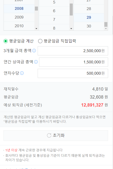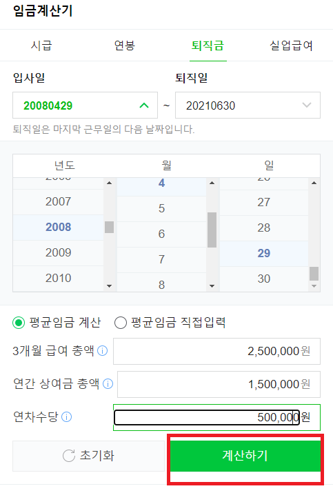2008년 4월29일부터 2021년 6월30일까지 근무한 경우 3개월 급여 총액과, 연간 상여금 총액, 연차수당 총액을 차례로 입력했다.