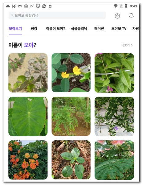 이름이 모야 라는 메뉴에서 여러종류의 꽃을 찾을 수 있거나 나무 종류를 찾을 수 있게 되어 있다. 이름만 잘 알고 있다면 상단 메뉴에서 검색 탭을 활용해서 손쉽게 나무 검색이 가능하다.