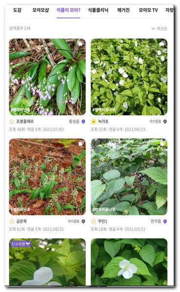 이름이 모야? 라는 메뉴에서는 회원들이 올린 나무 사진, 식물사진, 꽃사진, 버섯 사진 등 다양한 수목 사진들이 올라와서 내가 찾고자 하는 나무가 맞는것인지 눈으로 확인할 수 있어 좋았다.