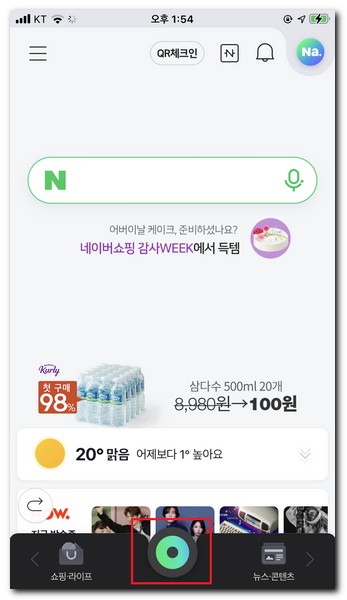 네이버 어플 하단 메뉴에서 동그랑색깔의 아이콘을 터치한다.