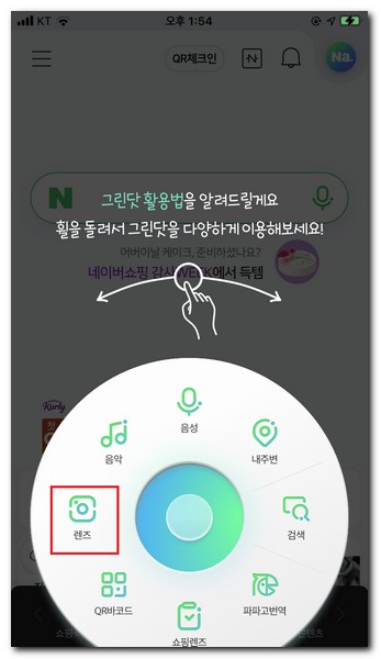 그린닷이라는 기능인데, 음악검색, 음성검색, 내주변 검색, 일반적인 검색기능, 파파고번역, 쇼핑렌즈, QR코드 검색, 렌즈 기능이 있다. 렌즈 옵션을 터치한다.
