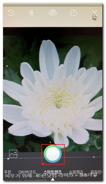 그럼 촬영할 수 있는 상태로 바뀌게 된다. 이 상태에서 꽃이름을 검색하거나 찾고자하는 사물에게 핸드폰으로 촬영을 하면 된다. 스마트렌즈 촬영버튼을 터치한다.