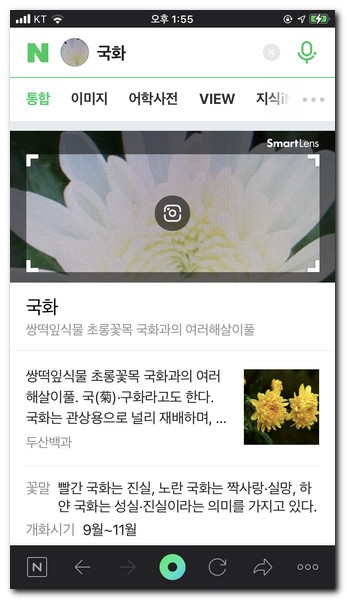 촬영이 완료되면 어떤꽃인지 자동으로 검색해준다. 필자가 찾는 꽃은 국화꽃이다. 쌍떡잎식물 초롱꽃목이며 국화과의 여러해살이풀로 분류되는 꽃이다.