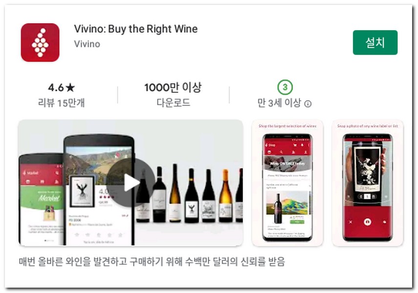 아이폰이나 갤럭시s20, 갤럭시s21 같은 안드로이드 스마트폰에서 vivino라고 검색을 하게 되면 buy the right wine이라는 이름의 앱이 보인다. 리뷰도 15만개고, 다운로드도 무려 1,000만개 이상이기 때문에 신뢰성이 매우 높은 어플이라는것을 알 수 있다.