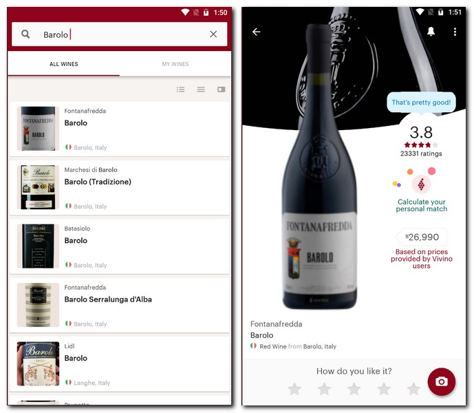 와인 검색도 당연히 가능한데 barolo을 검색했더니 관련된 정보들이 리스트에 나타나는걸 확인할 수 있다. 나라별로 동일한 이름으로 제조하는 와인들이 많고 와인 종류도 정말 많기 때문에 국가별로 지역별로 검색해보도록 하자.