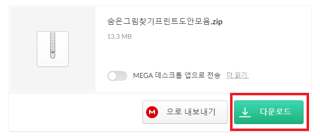 링크 연결된 페이지에 접속을 하게 되면 숨은그림찾기프린트도안모음.zip 으로 된 파일을 다운로드 받을 수 있다. 별도의 회원가입 없이 다운로드 가능하며 만약 회원가입을 해야된다는 메시지가 나타난다면 다운로드 횟수를 초과했기 때문에 발생된다.