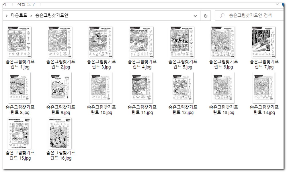 압축해제를 하면 총 16장의 무료 숨은 그림 찾기 프린트 도안이 보인다. 그림 하나하나를 클릭해서 보도록 하자.